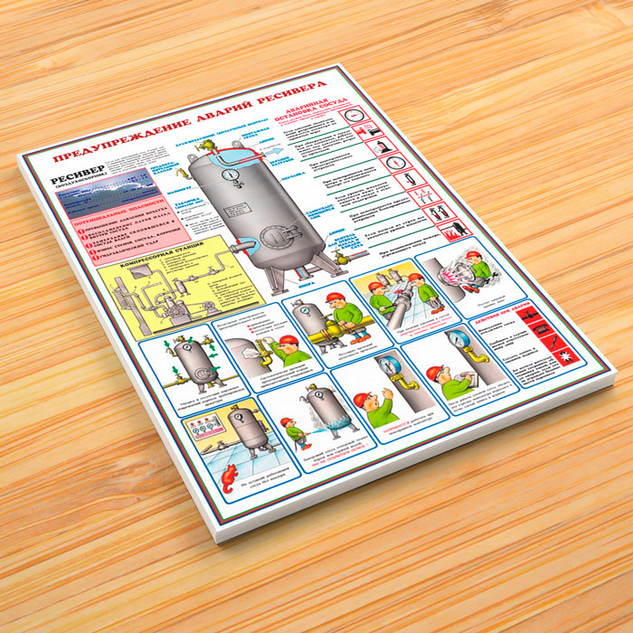 - Плакат «Предупреждение аварий ресивера» – устройство, аварийная остановка оборудования, техника безопасности при работе с ресивером, действия при аварии