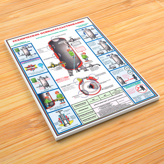 - Плакат «Техническое освидетельствование» – наружный и внутренний осмотры, подготовка к освидетельствованию, гидравлические испытания