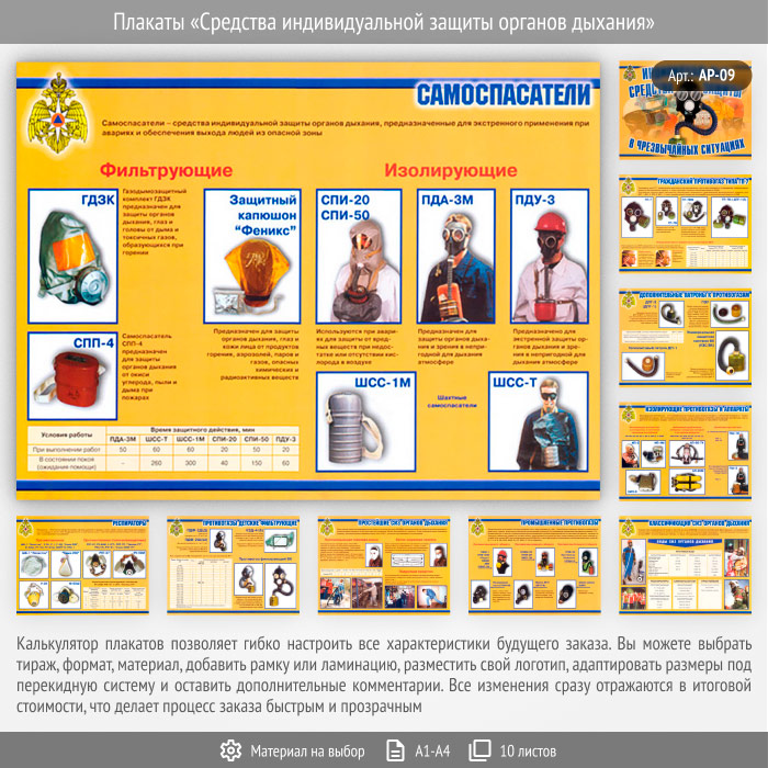 Комплект плакатов «Средства индивидуальной защиты органов дыхания» из 10 листов может быть изготовлен любого формата и размера, на бумаге, самоклеящейся пленке, пластике, баннерной ткани и металле. Разрабатываем, рисуем и изготавливаем плакаты на любую интересующую Вас тематику