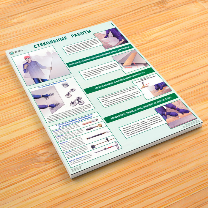 Комплект плакатов «Стекольные работы. Правила по охране труда» из 2 листов содержит информацию о правилах безопасного выполнения стекольных работ: подготовке места выполнения работ, дефектовке стекла перед резкой, требований к инструменту, правил выполнения резки и монтажа. Полезен для повышения профессинального мастерства, а также в качестве дополнительного пособия при проведении инструктажей по охране труда