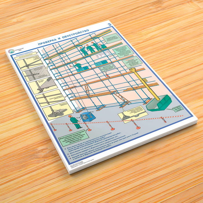 - Плакат «Проверка и обустройство» – правила проверки строительных лесов и оборудование всем необходимым