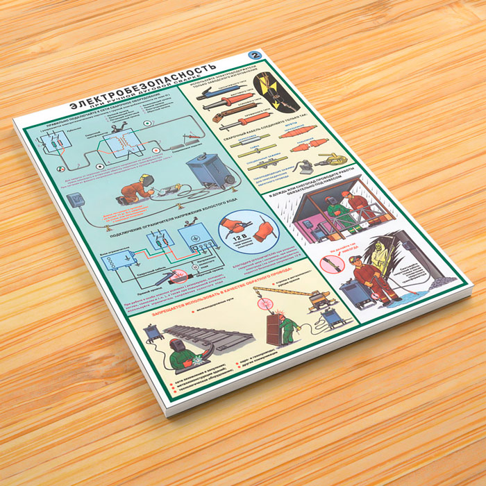 - Плакат «Электробезопасность при ручной дуговой сварке» – оборудование и правила выполнения работ