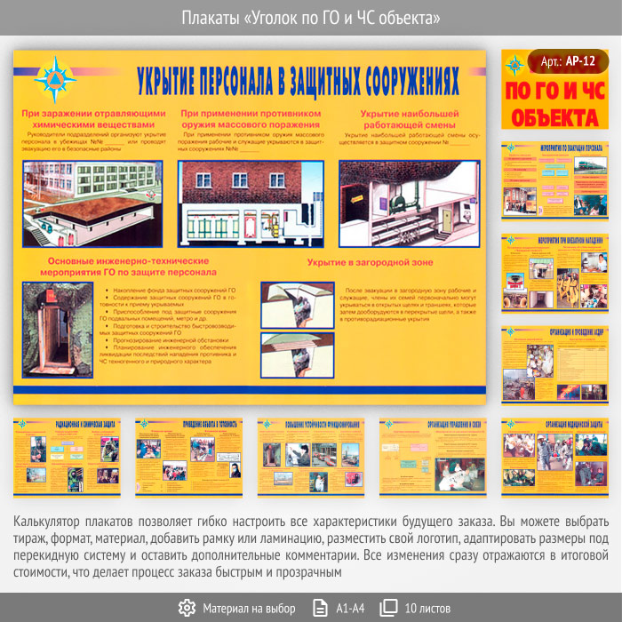 Комплект плакатов «Уголок по ГО и ЧС объекта» из 10 листов может быть изготовлен любого формата и размера, на бумаге, самоклеящейся пленке, пластике, баннерной ткани и металле. Разрабатываем, рисуем и изготавливаем плакаты на любую интересующую Вас тематику