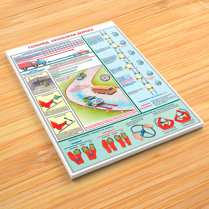 - Плакат «Гололед, скользкая дорога» – дистанция, способы торможения, тормозной путь, расположение рук и ступней, правила выведения из заноса