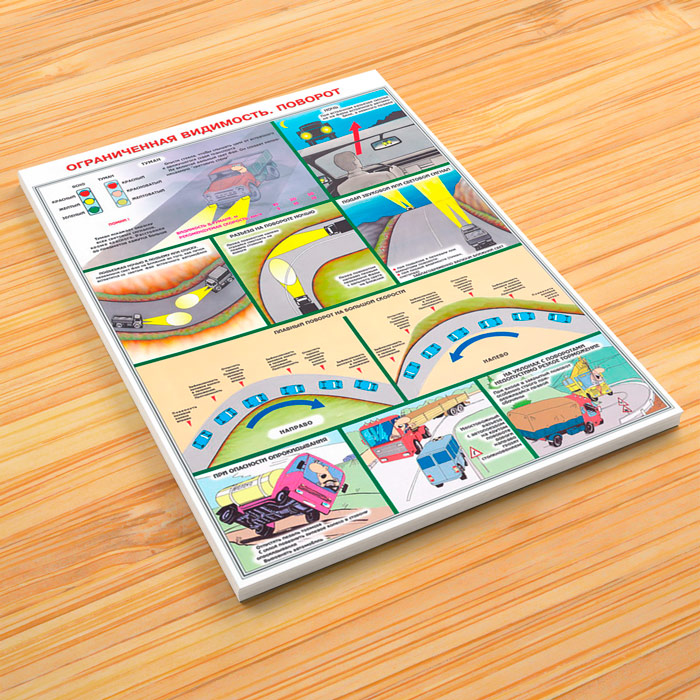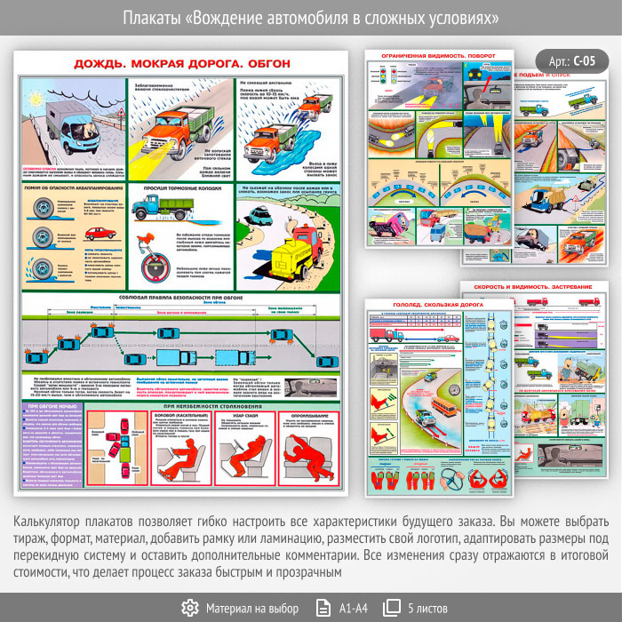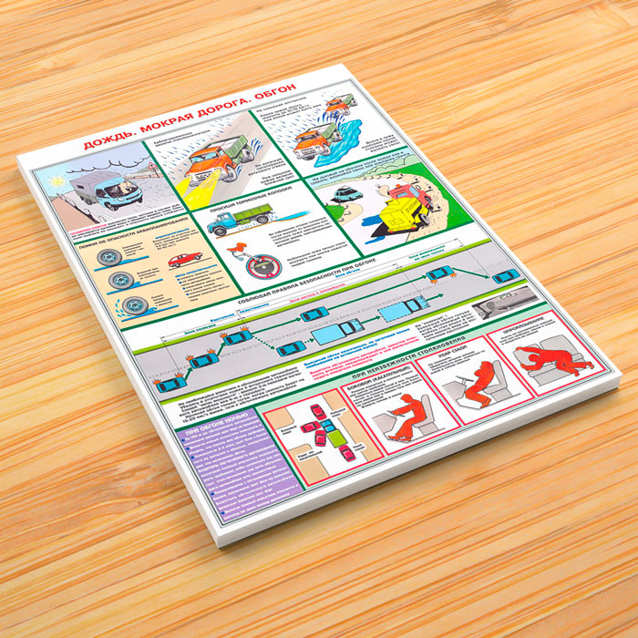 - Плакат «Дождь, мокрая дорога, обгон» – опасности и правила поведения, безопасность при обгоне и при обгоне ночью, что делать при неизбежном столкновении