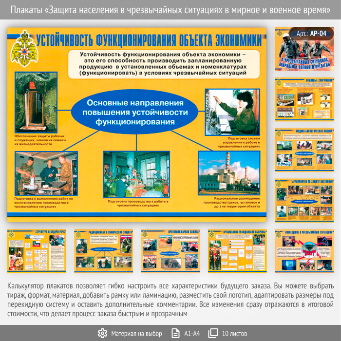 Комплект плакатов «Защита населения в чрезвычайных ситуациях в мирное и военное время» из 10 листов может быть изготовлен любого формата и размера, на бумаге, самоклеящейся пленке, пластике, баннерной ткани и металле. Разрабатываем, рисуем и изготавливаем плакаты на любую интересующую Вас тематику