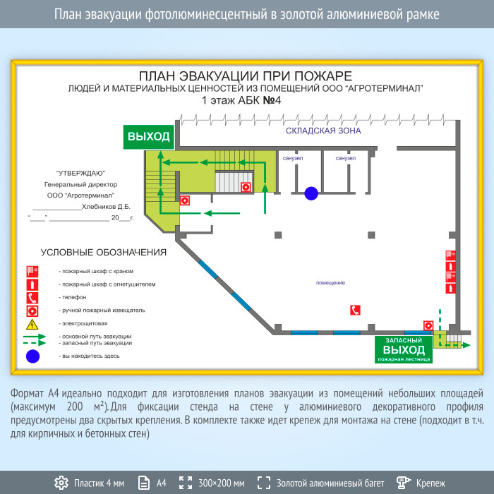 Предлагаем изготовление планов эвакуации А4-А0 форматов. В стоимость изготовления планов эвакуации на пластике в багетной рамке входит: разработка и согласование макета, прямая УФ-печать на 4-мм пластике, окантовка золотым алюминиевым багетом