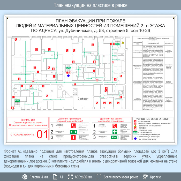Формат А1 идеально подходит для изготовления планов эвакуации больших площадей (до 1 км2) с большим количеством пожарного инвентаря. Содержит схематичное Изображение помещения с размещенными на нем средствами пожаротушения, путями эвакуации и условными обозначениями. Также содержит инструкцию при пожаре