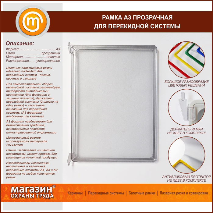 - Для самостоятельной сборки перекидной системы рекомендуем приобрести антибликовый протектор (для фиксации и защиты плаката), держатели перекидной системы (2 штуки на одну рамку) и настенное основание для перекидной системы (А3 формата - альбомное или книжное)