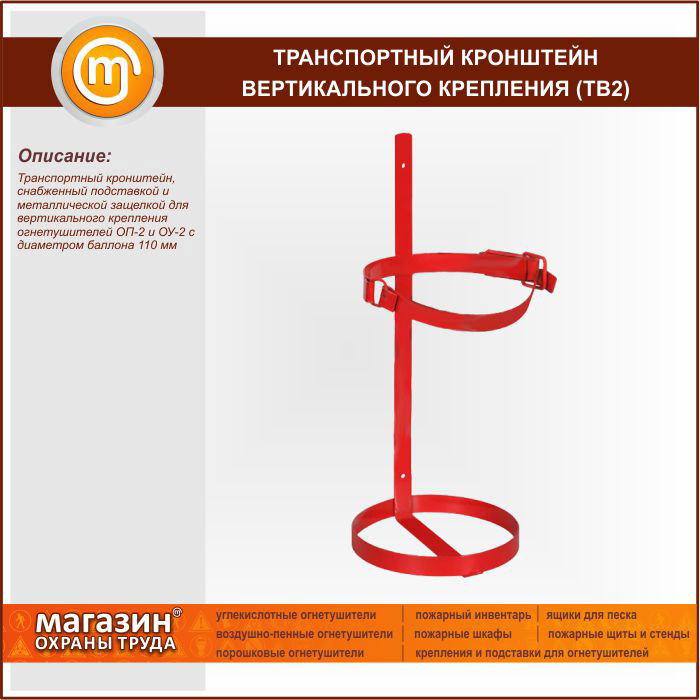 Транспортный кронштейн, снабженный подставкой и металлической защелкой для вертикального крепления огнетушителей ОП-2 и ОУ-2 с диаметром баллона 110 мм