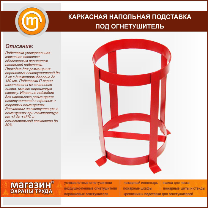Подставка универсальная каркасная является облегченным вариантом напольной подставки. Пригодна для размещения переносных огнетушителей до 5 кг с диаметром баллона до 150 мм. Подставки П-серии изготовлены из стального листа, имеют порошковую окраску. Идеально подходит для напольного размещения огнетушителей в офисных и торговых помещениях. Рассчитаны на эксплуатацию в помещениях при температуре от +5 до +45ºС и относительной влажности до 80%