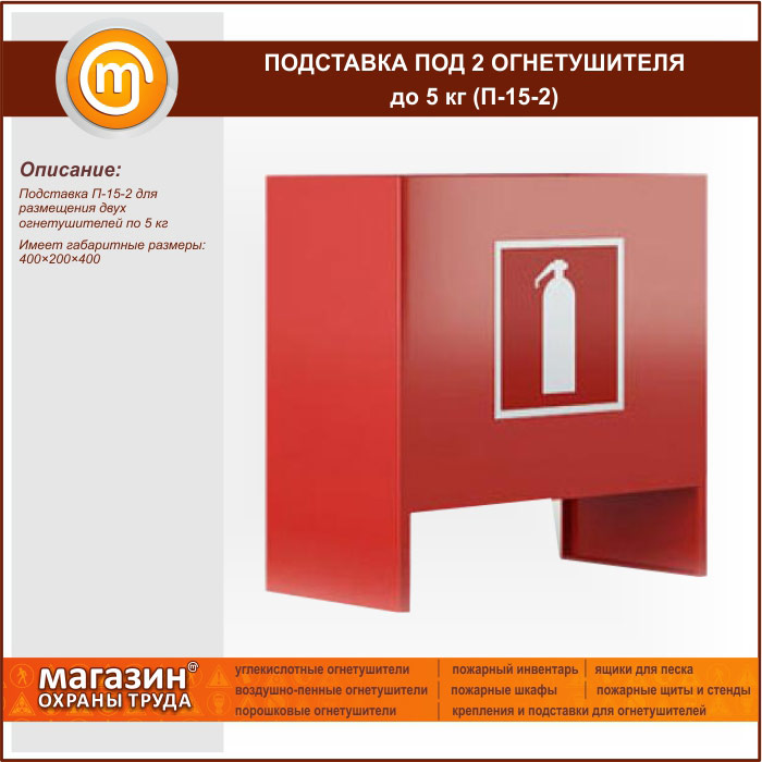 Подставка П-15-2 для размещения двух огнетушителей по 5 кг. Имеет габаритные размеры 400×200×400