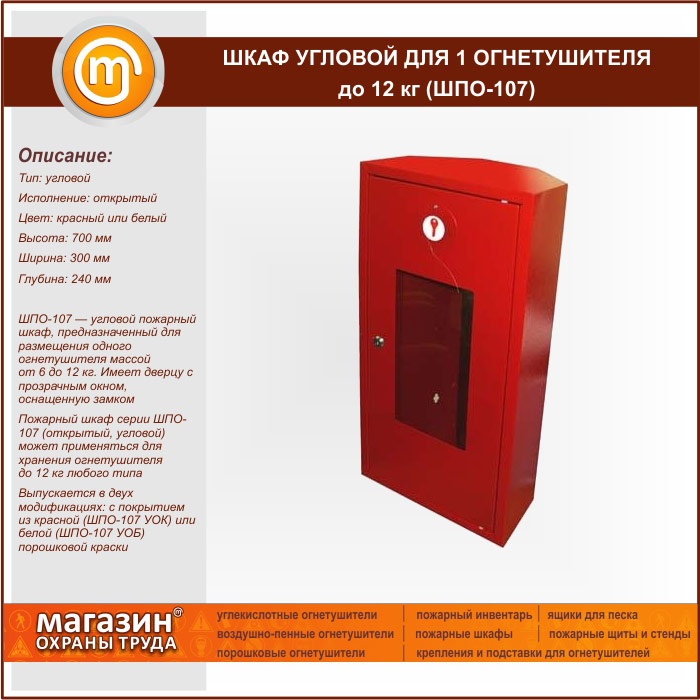 ШПО-107 — угловой пожарный шкаф, предназначенный для размещения одного огнетушителя массой от 6 до 12 кг. Имеет дверцу с прозрачным окном, оснащенную замком
