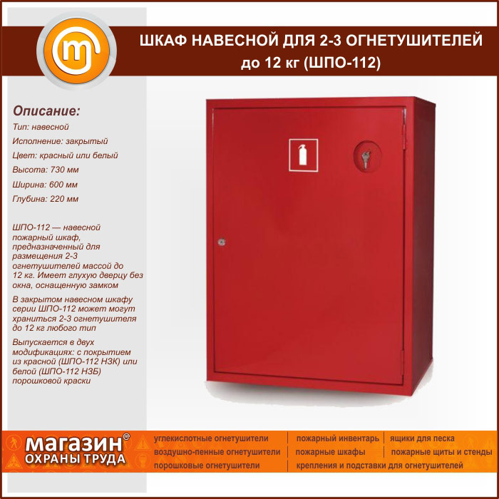 ШПО-112 — навесной пожарный шкаф, предназначенный для размещения 2-3 огнетушителей массой до 12 кг. Имеет глухую дверцу без окна, оснащенную замком