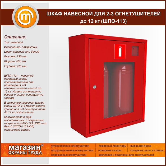 ШПО-113 — навесной пожарный шкаф, предназначенный для размещения 2-3 огнетушителей массой до 12 кг. Имеет остекленную дверцу с окном, оснащенную замком