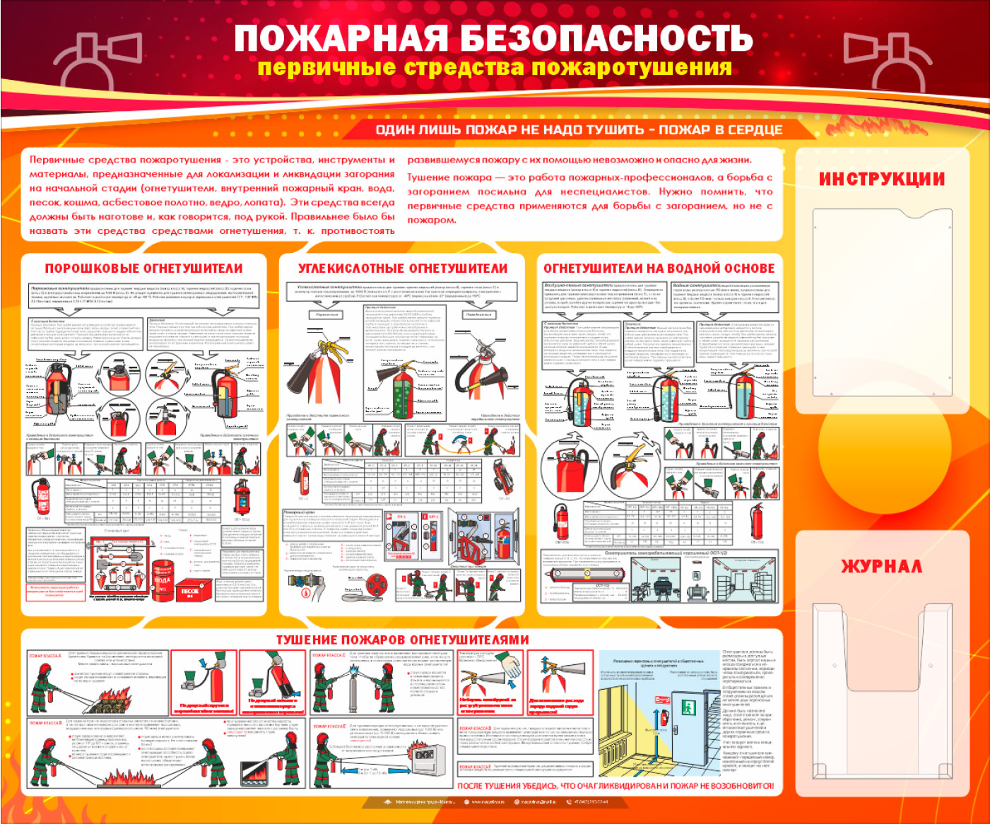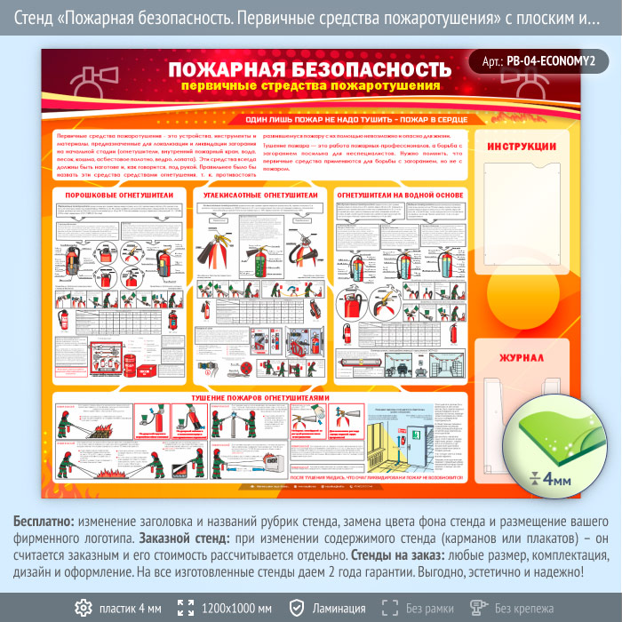 Стенд «Пожарная безопасность. Первичные средства пожаротушения» – это яркое пособие для изучения первичных средств пожаротушения: порошковые огнетушители, углекислотные и огнетушители на водной основе – их устройство, хранение и использование, а также примеры как правильно использовать огнетушители во время пожара. На стенде установлено два кармана А4 формата: плоский – для инструкций и объемный – для журнала…