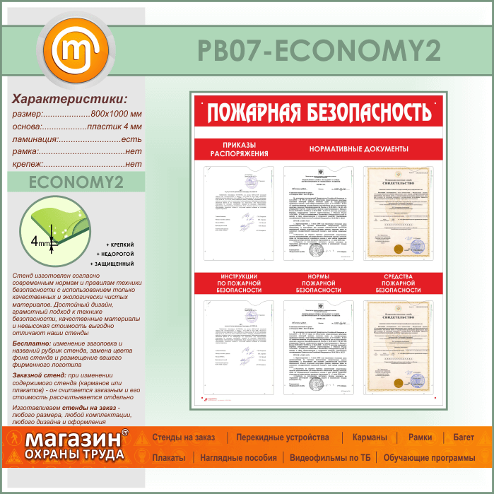 Стенд «Пожарная безопасность» – это небольшой уголок ПБ, подходящий для любого предприятия – на нем установлено 6 плоских карманов А4 формата для самостоятельного размещения информации под рубриками: приказы и распоряжения, нормативные документы, инструкции по пожарной безопасности, нормы пожарной безопасности, средства пожарной безопасности…