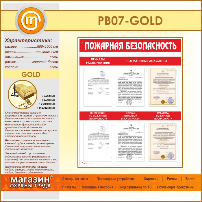 Стенд «Пожарная безопасность» с 6 карманами (PB-07-GOLD)