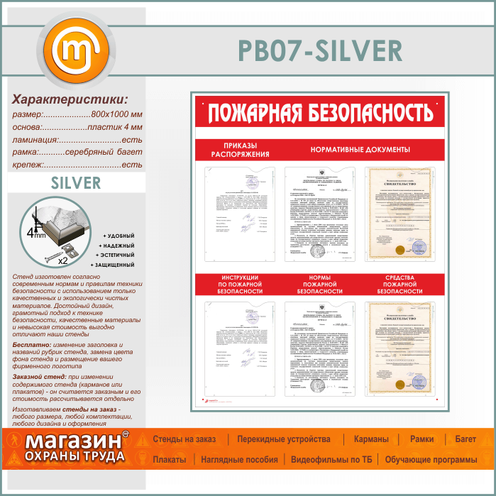 Стенд «Пожарная безопасность» с 6 карманами (PB-07-SILVER)
