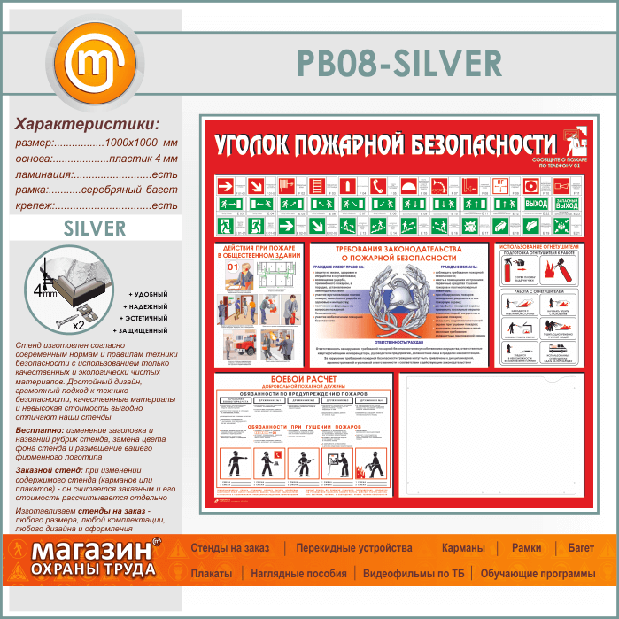 Стенд «Уголок пожарной безопасности» с карманом А3 формата (PB-08-SILVER)