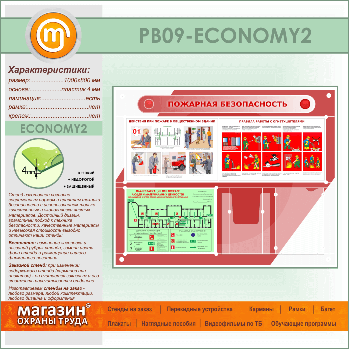 Стенд «Пожарная безопасность» с планом эвакуации, плоским и объемным карманами (PB-09-ECONOMY2)