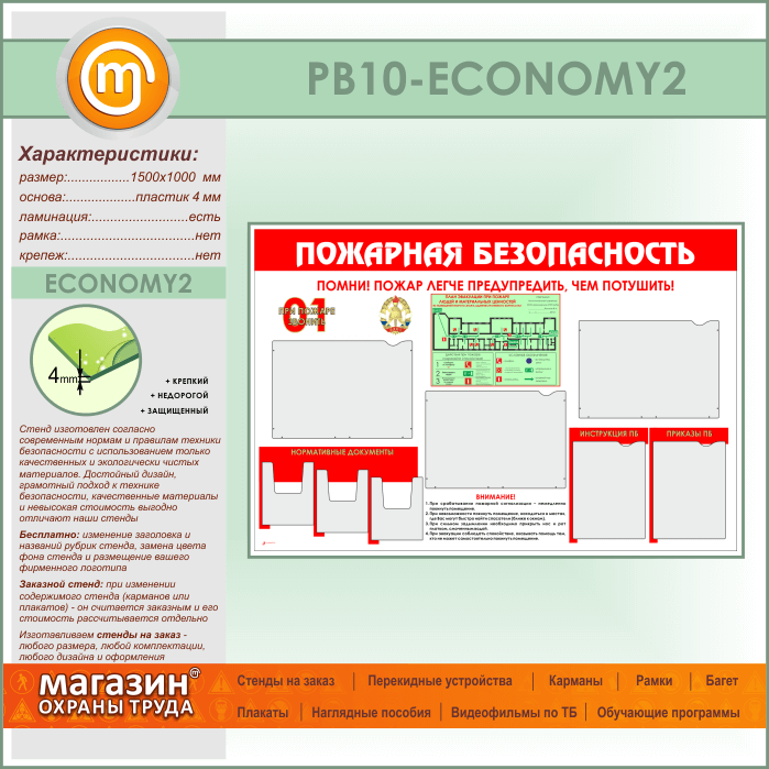 Стенд «Пожарная безопасность» с планом эвакуации, 5 плоскими и 3 объемными карманами (PB-10-ECONOMY2)