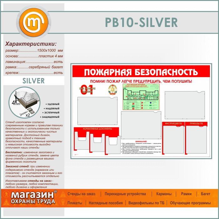 Стенд «Пожарная безопасность» с планом эвакуации, 5 плоскими и 3 объемными карманами (PB-10-SILVER)