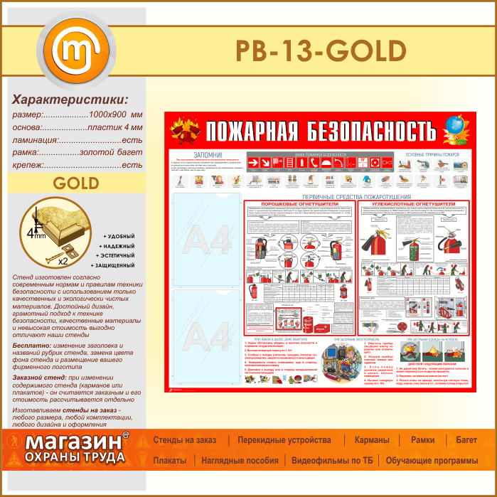 Стенд «Пожарная безопасность» с 2 карманами (PB-13-GOLD)