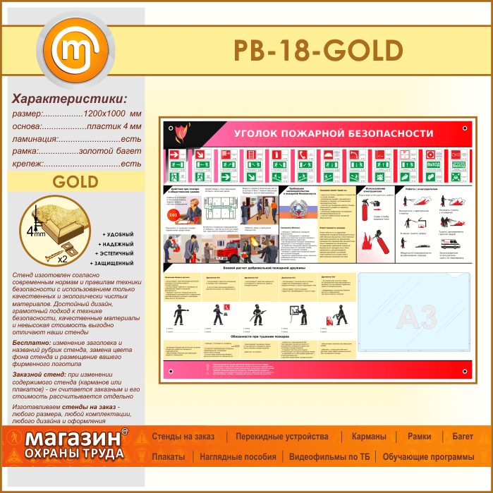 Стенд «Уголок пожарной безопасности» с карманом А3 формата (PB-18-GOLD)