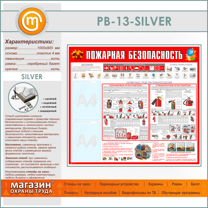 Стенд «Пожарная безопасность» с 2 карманами (PB-13-SILVER)