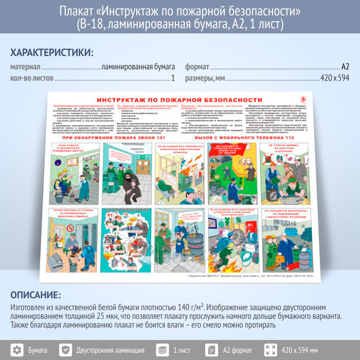 Плакат «Инструктаж по пожарной безопасности» (В-18, ламинированная бумага, А2, 1 лист)