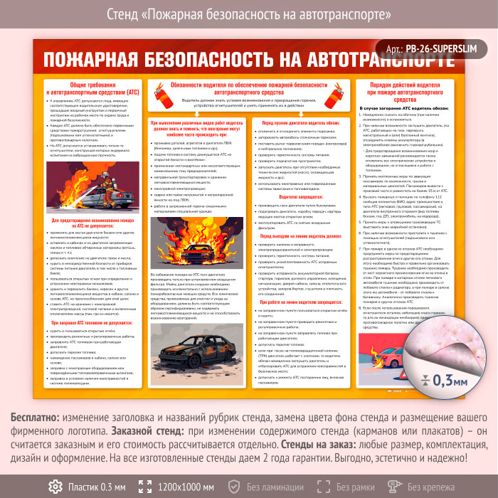 Стенд «Пожарная безопасность на автотранспорте» (PB-26)это важный инструмент для обеспечения безопасности на дороге. Он содержит ключевую информацию о требованиях к автотранспортным средствам, обязанностях водителей по поддержанию пожарной безопасности и порядке действий в случае возгорания. Стенд поможет подготовить водителей к чрезвычайным ситуациям и обеспечит безопасность как для них самих, так и для окружающих.