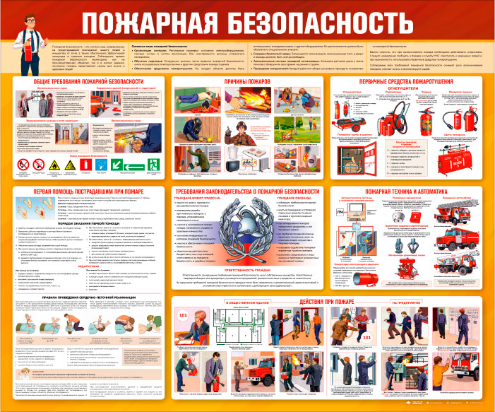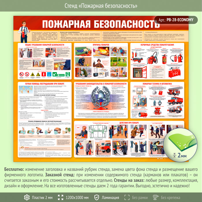 Стенд «Пожарная безопасность» (PB-28)это комплексное руководство по предотвращению и реагированию на пожары. Он охватывает общие требования пожарной безопасности, основные причины возгораний и использование первичных средств пожаротушения. Также представлены требования законодательства, информация о пожарной технике и автоматике, действия при пожаре в общественных зданиях и на предприятиях, а также инструкции по оказанию первой помощи пострадавшим. Этот стенд поможет создать безопасную среду и подготовить сотрудников к эффективным действиям в чрезвычайных ситуациях.
