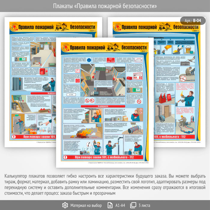 В комплекте плакатов из 3 листов «Правила пожарной безопасности» описываются основные правила пожарной безопасности на предприятии, размещение средств пожаротушения, правила содержания эвакуационных выходов и пожарных проездов, правила проведения пожароопасных работ, условия хранения легкогорючих веществ и баллонов с газом