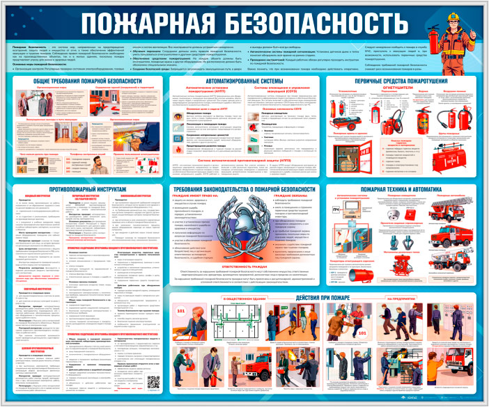 Стенд «Пожарная безопасность» (PB-29)содержит наглядную информацию по обеспечению пожарной безопасности на объекте. На стенде представлены общие требования, порядок проведения противопожарного инструктажа, действия при пожаре в общественных зданиях и на предприятиях. Освещены виды первичных средств пожаротушения, автоматизированные системы защиты, средства оповещения и эвакуации, а также требования законодательства и ответственность граждан. Стенд помогает формировать культуру безопасности, обучать персонал и предотвращать чрезвычайные ситуации, связанные с пожарами.