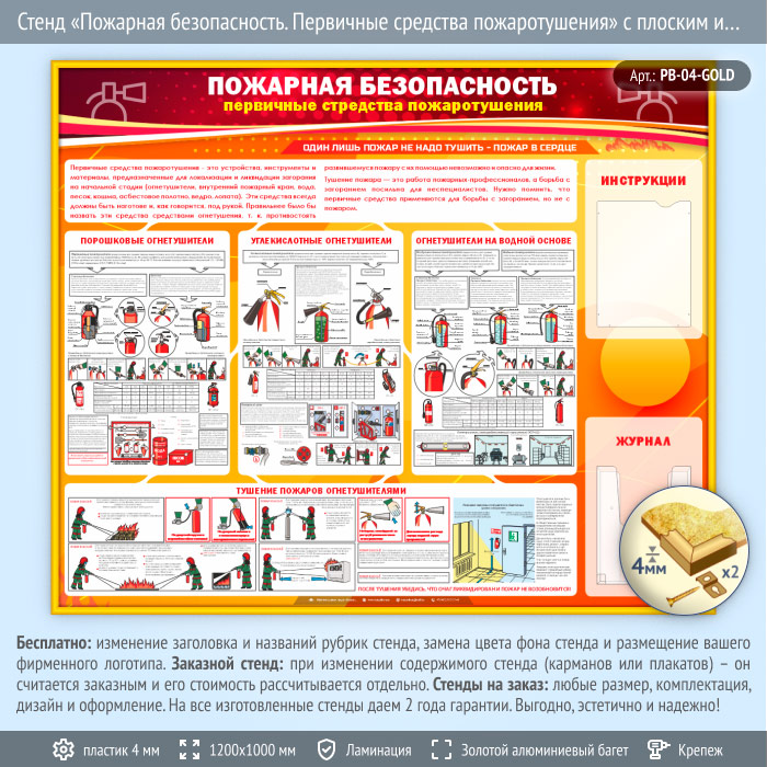 Стенд «Пожарная безопасность. Первичные средства пожаротушения» с плоским и объемным карманами (PB-04-GOLD)