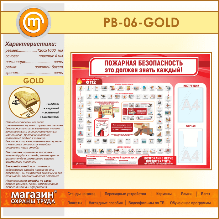 Стенд «Пожарная безопасность. Это должен знать каждый» с плоским и объемным карманами (PB-06-GOLD)