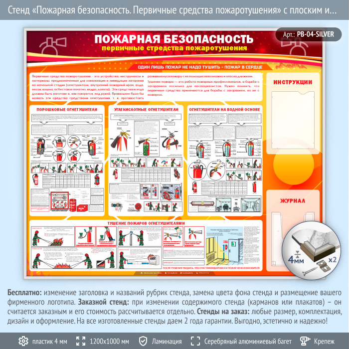 Стенд «Пожарная безопасность. Первичные средства пожаротушения» с плоским и объемным карманами (PB-04-SILVER)