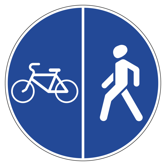 Знаком обозначается велопешеходная дорожка с разделением на велосипедную и пешеходную стороны дорожки, выделенные конструктивно и (или) обозначенные горизонтальной разметкой 1.2.1, 1.2.2, 1.23.2 и 1.23.3 или иным способом