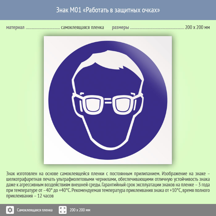 Знак M01 «Работать в защитных очках» на пленке, размером 200х200 мм указывает на место хранения медицинской аптечки или препаратов. Предписывающие знаки безопасности изготовлены согласно ГОСТ Р 12.4.026-2015 и предназначены для обозначения обязательных действий с целью избежания возможных травм и прочих опасностей
