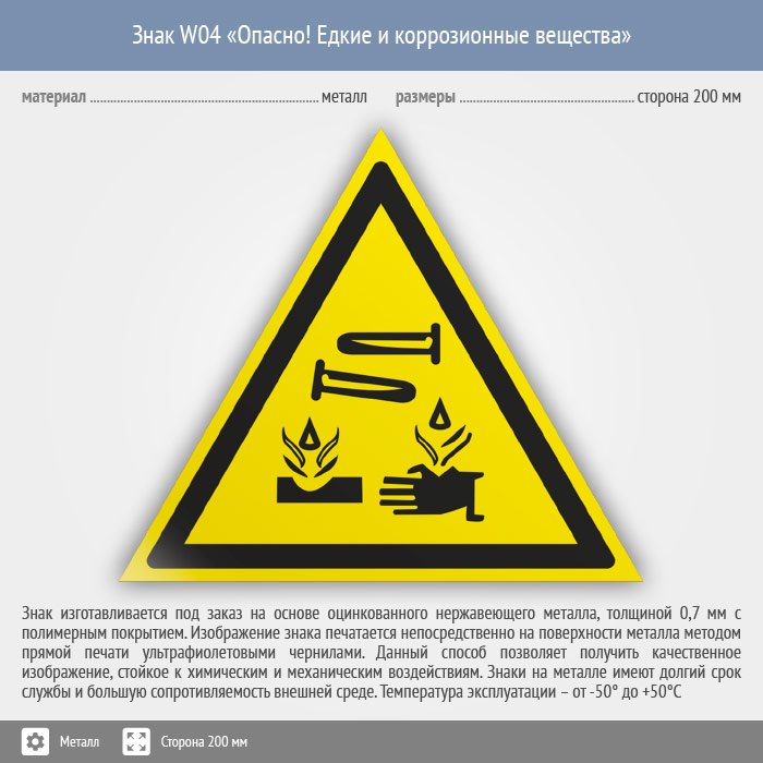 Знак W04 «Опасно! едкие и коррозионные вещества» на металле, размером стороны 200 мм предупреждает о едких и коррозионных веществах, находящихся внутри. Предупреждающие знаки безопасности изготовлены согласно ГОСТ Р 12.4.026-2015 и предназначены для предупреждения людей о возможной опасности