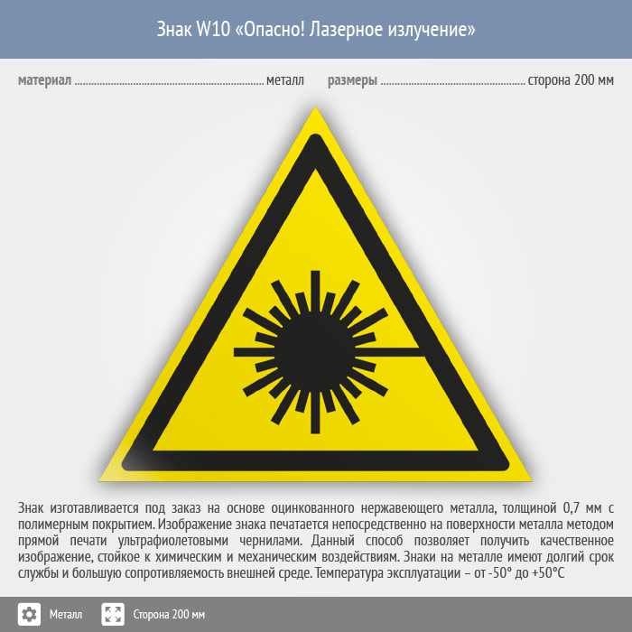 Знак W10 «Опасно! лазерное излучение» на металле, размером стороны 200 мм предупреждает о работе лазерного оборудования, представляющего угрозу неподготовленным. Предупреждающие знаки безопасности изготовлены согласно ГОСТ Р 12.4.026-2015 и предназначены для предупреждения людей о возможной опасности