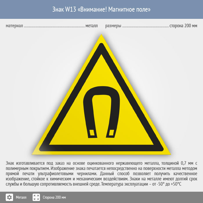Знак W13 «Внимание! магнитное поле» на металле, размером стороны 200 мм вывешивается вблизи действия установок, вырабатывающих или использующих сильное магнитное поле. Предупреждающие знаки безопасности изготовлены согласно ГОСТ Р 12.4.026-2015 и предназначены для предупреждения людей о возможной опасности
