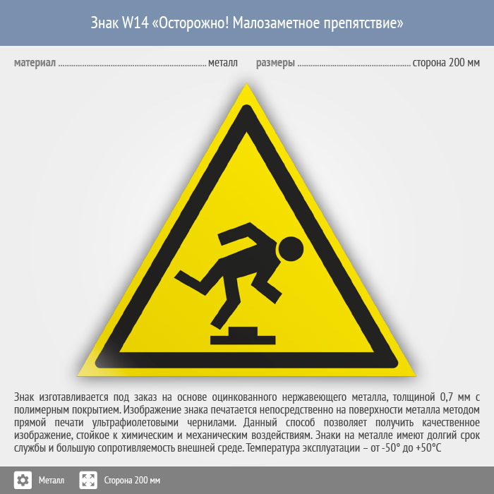 Знак W14 «Осторожно! малозаметное препятствие» на металле, размером стороны 200 мм предупреждает, что здесь есть незаметное препятствие и что надо быть повнимательнее. Предупреждающие знаки безопасности изготовлены согласно ГОСТ Р 12.4.026-2015 и предназначены для предупреждения людей о возможной опасности