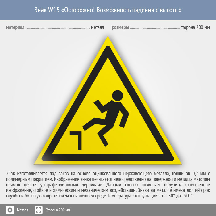 Знак W15 «Осторожно! возможность падения с высоты» на металле, размером стороны 200 мм предупреждает, что здесь можно упасть, размещается на пандусах в зонах погрузки или разгрузки. Предупреждающие знаки безопасности изготовлены согласно ГОСТ Р 12.4.026-2015 и предназначены для предупреждения людей о возможной опасности