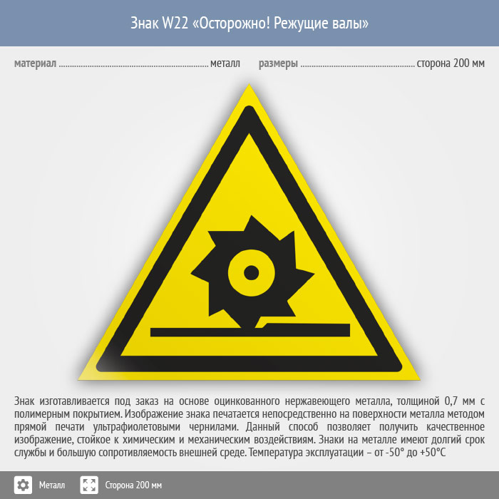 Знак W22 «Осторожно! режущие валы» (металл, сторона 200 мм)