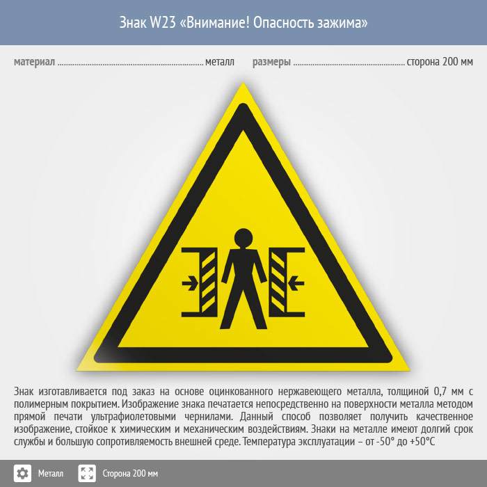 Знак W23 «Внимание! опасность зажима» на металле, размером стороны 200 мм размещают в опасных местах для предупреждения травматизма. Предупреждающие знаки безопасности изготовлены согласно ГОСТ Р 12.4.026-2015 и предназначены для предупреждения людей о возможной опасности