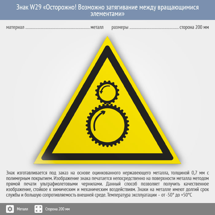 Знак W29 «Осторожно! возможно затягивание между вращающимися элементами» (металл, сторона 200 мм)