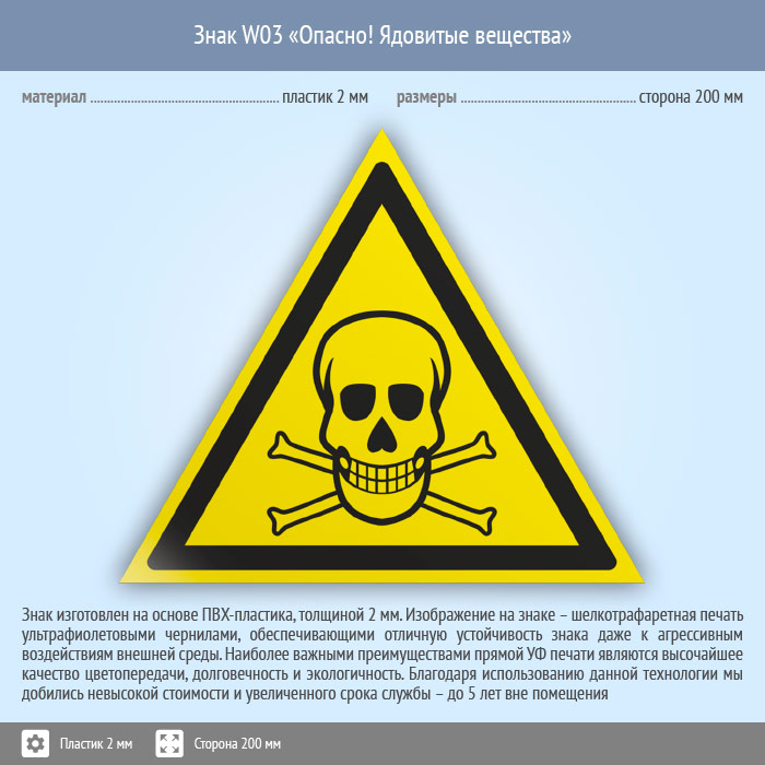 Знак W03 «Опасно! ядовитые вещества» (пластик, сторона 200 мм)