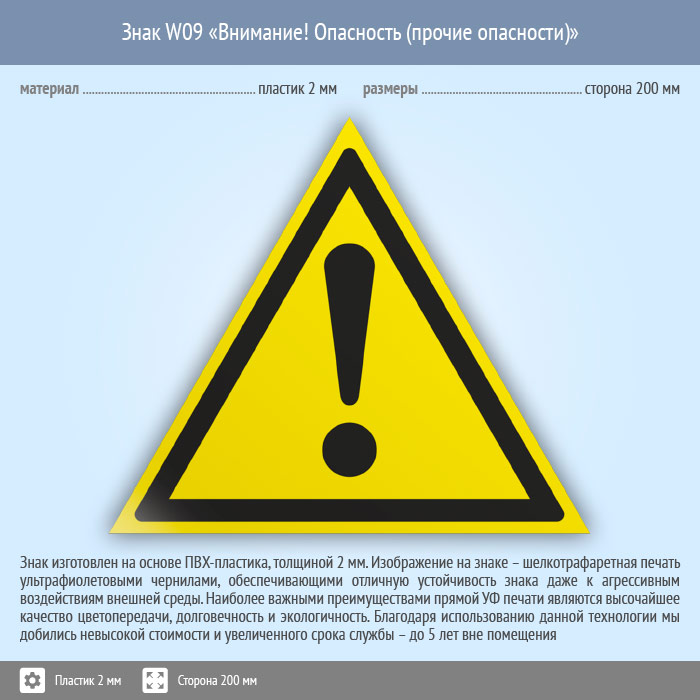 Знак W09 «Внимание! опасность (прочие опасности)» на пластике, размером стороны 200 мм обозначает любую опасность с целью привлечения внимания, идет в комбинации поясняющей надписью. Предупреждающие знаки безопасности изготовлены согласно ГОСТ Р 12.4.026-2015 и предназначены для предупреждения людей о возможной опасности